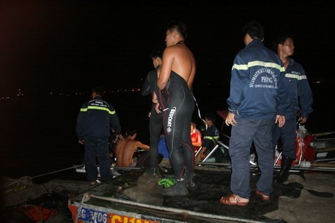 Công tác tìm kiếm người mất tích được tiếp tục. Đến 18g, một chiếc tàu chở 15 chiến sĩ thuộc phòng cứu nạn cứu hộ Sở cảnh sát PCCC TP.HCM cập sát mạn tàu. Người nhái vào cuộc.