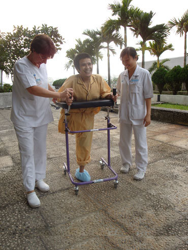 | Anh Hải tự đi bước đi đầu tiên sau ca đại phẫu. Ảnh: Bệnh viện FV. |