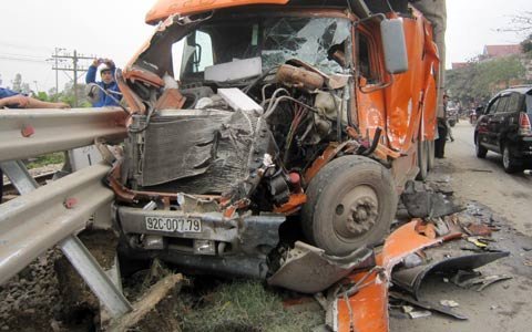 Chiếc xe container bị chiếc xe khách mất lái đâm nát phần đầu.