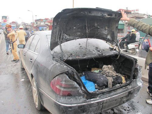 Cho đến 9h sáng, đám cháy đã được dập tắt nhưng chiếc xe vẫn chưa được di chuyển đi.