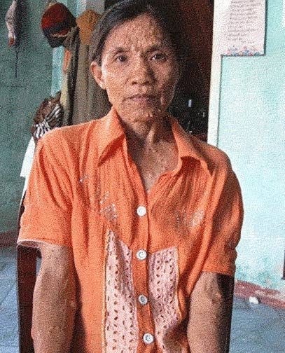 | Bà Nghĩa với gương mặt hàng trăm khối u lớn nhỏ mọc chi chít trên mặt và trên khắp thân thể rất khó chịu. |