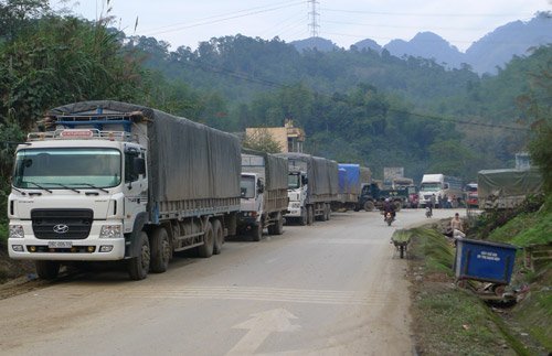 Nhiều xe chở hàng hóa tới khu vực này phải dừng lại chờ đường thông mới tiếp tục di chuyển.