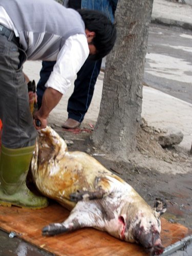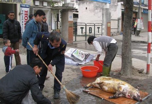 Vào hồi 11h trưa 21/2, nhiều người đi đường đã rất bất ngờ và tỏ thái độ khó chịu khi chứng kiến cảnh giết mổ lợn giữa ban ngày, ngay trên hè phố đông đúc.