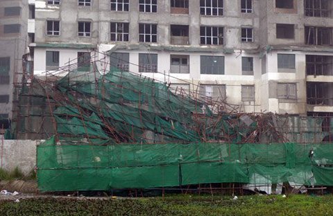 | Toàn bộ hệ thống giàn giáo trát tường bị độ sập khiến 5 công nhân bị vùi lấp |