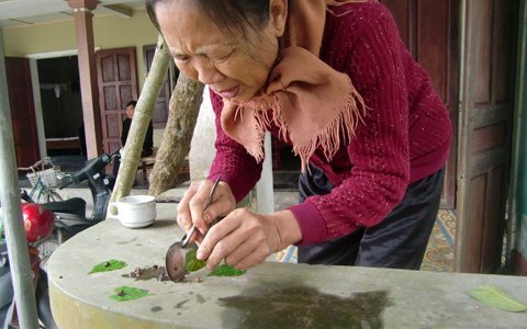 | Bà Dung cẩn thận gói gém từng chiếc mật cóc vào lá khoai non đã được chần qua. |