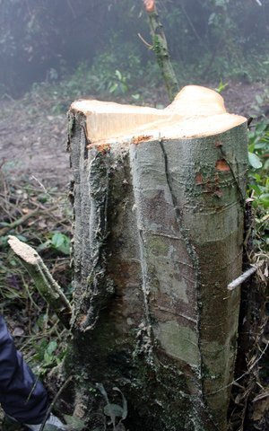 Bên cạnh những phiến gỗ đã được triệt hạ từ lâu thì còn xuất hiện nhiều gốc cây mà dấu vết còn mới. Sau khi hạ xong cây, thân cây chưa kịp xẻ và được vứt chỏng chơ giữa rừng. Cạnh đó là những cây thân gỗ rất lớn đã được lâm tặc đánh dấu, chưa kịp chặt hạ.