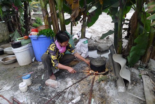| Bà Nguyễn thị Xuyến chuẩn bị bữa cơm chiều bên cạnh gốc chuối, cánh đồng nơi mà trước đây chăn thả vịt, giờ phủ đầy một mầu trắng của vôi bột. |