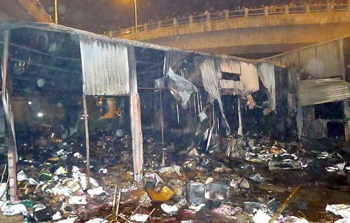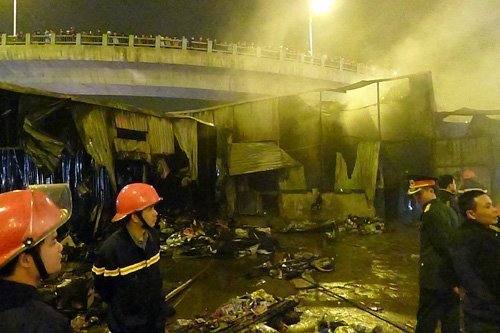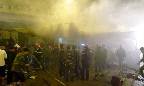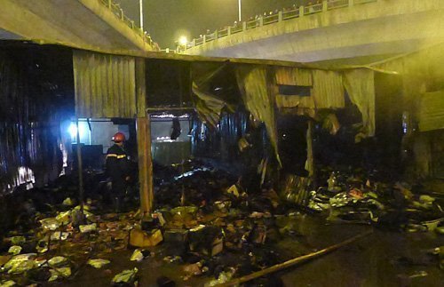 Hiện trường vụ cháy dưới chân cầu Vĩnh Tuy - Ảnh: Phạm Hải