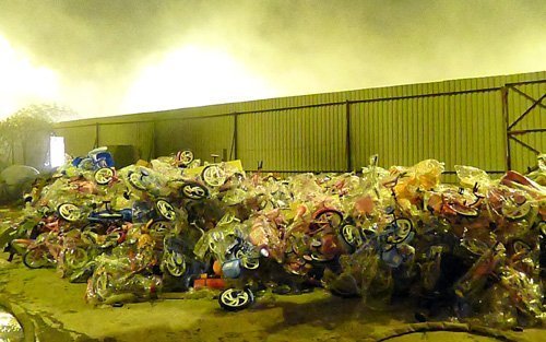 Một lượng hàng hóa lớn, gồm các xe đạp nhựa và đồ nhựa dễ cháy đã được lực lượng cứu hộ tập kết ra khu vực an toàn.