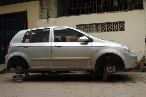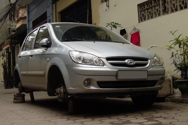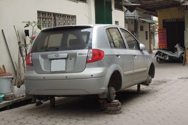 3 bánh xe bị mất được kê bằng gạch để xe không đổ, sập.