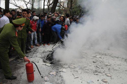 Vào khoảng 1h chiều nay (23/3), một chiếc xe máy mang nhãn hiệu Attila Elizabeth màu trắng, biển số 30F7 - 4121 do một người phụ nữ lái đã bị bốc cháy khi đang di chuyển trên phố Trần Nhân Tông, đoạn đối diện với hồ Thiền Quang.