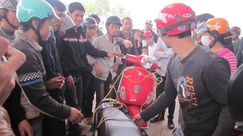 Điểm bán xăng Đồi Nên còn trở nên náo động hơn khi một chiếc xe VespaLX đỏ mang
