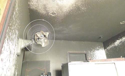 Tại hiện trường, căn phòng nhỏ với 2 giường ngủ có lắp 1 điều hòa đã bị cháy đen sau hỏa hoạn, chiếc két sắt để ngoài ban công cũng bị bà hỏa thiêu rụi. Nước lênh láng dưới sàn gỗ.