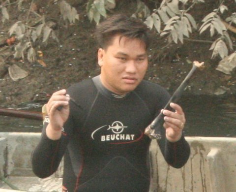 ngụp lặn dưới dòng kênh đen ngòm, cả hai vớt được một xe gắn máy đã rỉ sét có