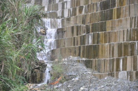 Còn bên nách trái sát cửa tràn xả lũ, nước vẫn tuôn đổ như thác. Bởi đây là khu vực hiểm trở rất khó tiếp cận nên đơn vị thi công chưa đưa ống nhựa vào thu gom nước như bên nách phải cạnh tràn xả lũ.