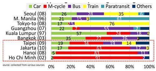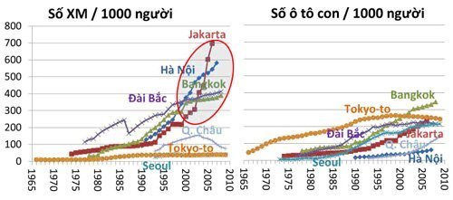 | Bảng so sánh GDP đầu người của vài TP châu Á, sở hữu ô tô xe máy và thị phần vận tải của các phương tiện giao thông đô thị |