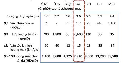 So sánh khả năng vận chuyển hành khách trên cùng một làn đường rộng 3,6m, xe máy chở nhiều gấp 2 lần xe buýt, gấp 5 lần ô tô đường phố, xấp xỉ với xe buýt nhanh (BRT), bằng 1/2 đường sắt nhẹ (LRT) và 1/5 tầu điện ngầm (MRT).