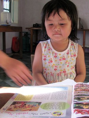Tin đồn về khả năng đặc biệt của một cô bé 3 tuổi, biết đọc, làm toán, hát tiếng Anh khiến chúng tôi không khỏi tò mò tìm đến “mục sở thị” xem liệu đó có phải là sự thật. Mới đến đầu xóm Tân Hòa, xã Hòa Hải hỏi địa chỉ nhà cô bé “thần đồng” ai ai cũng biết, họ còn nhiệt tình dẫn đường đưa chúng tôi đến tận nhà.