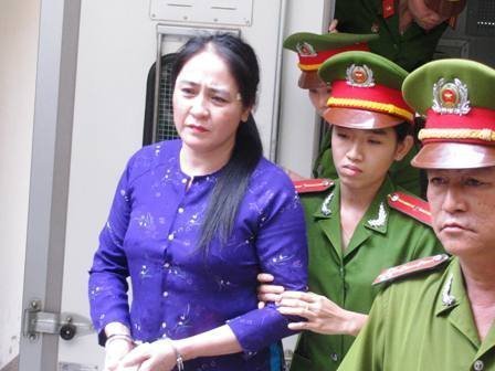 | Bị cáo Trần Thúy Liễu vì lý do sức khỏe nên được phép vừa ngồi vừa trả lời Hội đồng xét xử. Nhiều lần gục trước vành móng ngựa. |