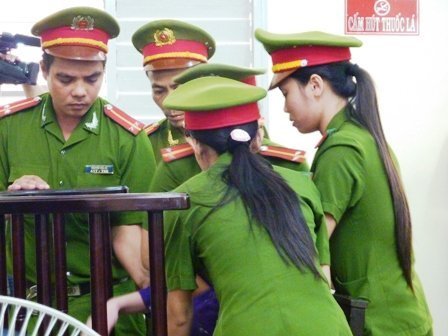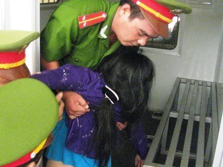 | Bà Liễu ra khỏi tòa với mức án chung thân phải có sự hỗ trợ của các cảnh sát và không thể đứng gượng dậy khi lên xe về trại giam. |