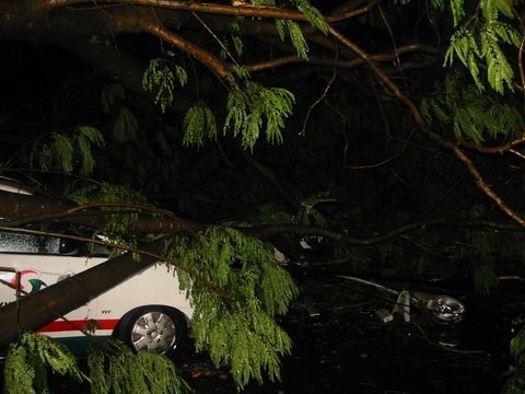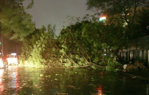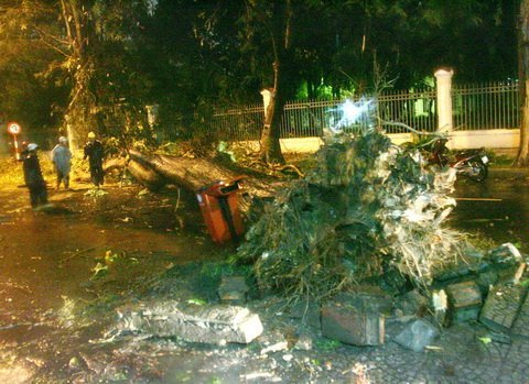 | Cây đổ ở công viên Hoàng Văn Thụ trong lúc bão tràn về. |