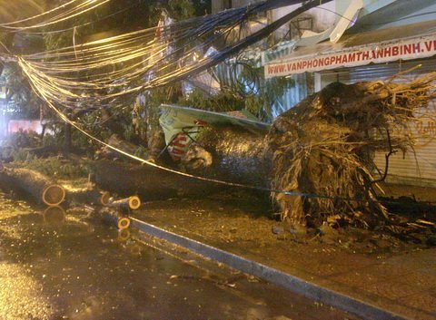 | Cây đổ kéo theo hệ thống điện và cáp viễn thông trên đường Đinh Tiên Hoàng. |
