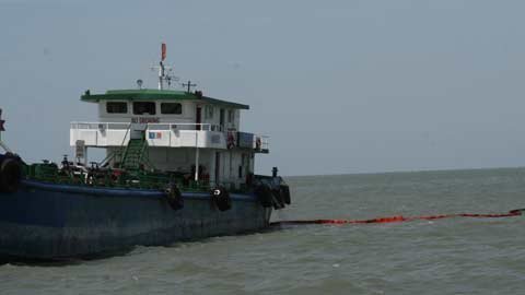 Tàu cứu ứng cứu sự cố tràn dầu đang giăng phao trên biển, kịp thời xử lý sự cố xảy ra. |