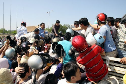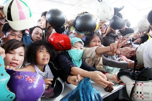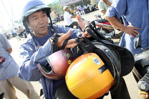 | Ai cũng chen lấn để cố đổi cho được những chiếc mũ mới theo đúng quy định. (Ảnh: V.Thi) |