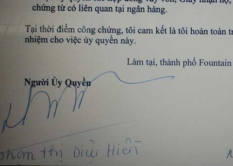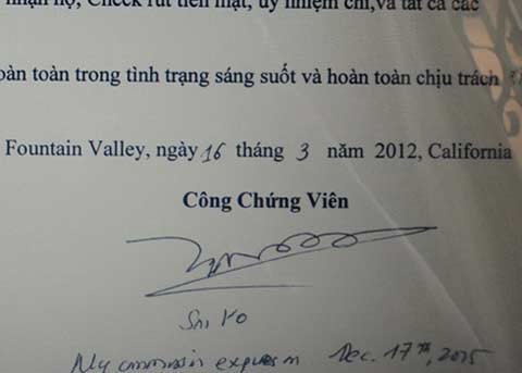 Giấy ủy quyền này được chứng thực ngày 16/3 tại bang Massachusetts. Sau đó, Đại sứ quán Việt Nam tại Mỹ đã xác nhận bằng giấy ủy quyền số 1088/DSQ-HVH12 do ông Nguyễn Hồng Hà, Tham tán đại sứ quán Việt Nam tại Hoa Kỳ ký ngày 3/4/2012.