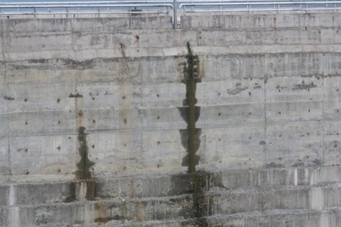 Các điểm thấm nước trên thân đập chính phía hạ lưu vẫn còn những vệt nước rỉ nhìn rõ mồn một qua ống kính máy ảnh. Như vậy, nước vẫn còn thấm dưới thân đập, mặc dù nước trên hồ chứa đã hạ xuống cao trình 140 m