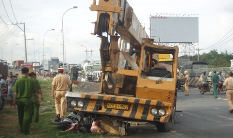 Chiếc xe cẩu mất lái, lao đi vun vút khi đổ dốc rồi loạng choạng, nuốt trọn 5 chiếc xe máy vào gầm khiến 3 người chết thảm.