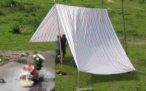 Phía trên bờ người thân anh D. đang dựng lều và lập bàn thờ cầu khấn.