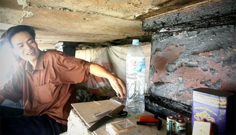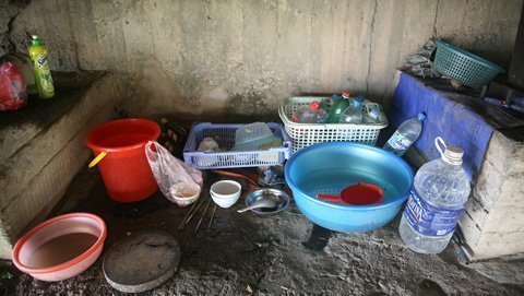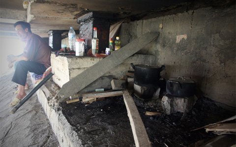 Cuộc sống tại đây rất khổ cực, để lên được "căn hộ" này phải leo lên 1 con dốc thẳng đứng cao hơn 10m. Hằng ngày, anh Tuấn phải đi xin 2 xô nước từ những gia đình người dân sống xung quanh để sinh hoạt nấu nướng. Khu vực bếp củi được bố trí ngay khoang bên cạnh.