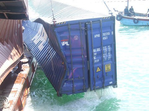 | Nhiều container bị bóp méo khi được đưa lên sà lan. |
