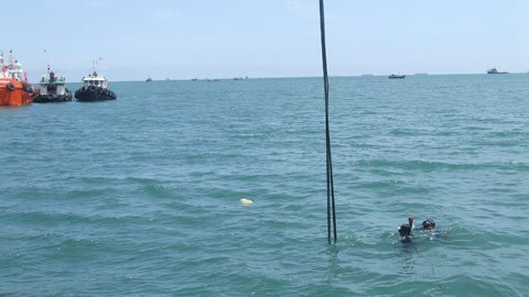 | Thợ lặn xác định vị trí và lặn xuống để chằng thiết bị cẩu vào các container |