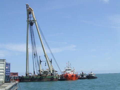 | Tàu cẩu ra hiện trường ngày 23/4. |