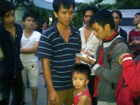 Chồng sản phụ Hồng Thu (áo sọc) cùng con trai đầu lòng đau xót trước sự ra đi đột ngột của vợ. Ảnh: Báo NLĐ |