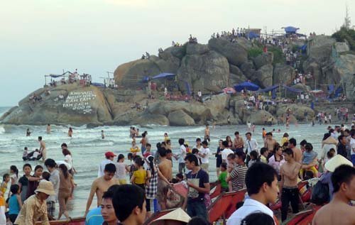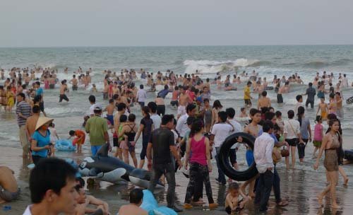 | Bãi tắm Sầm Sơn đông nghẹt người tắm biển |
