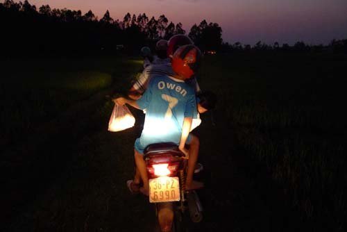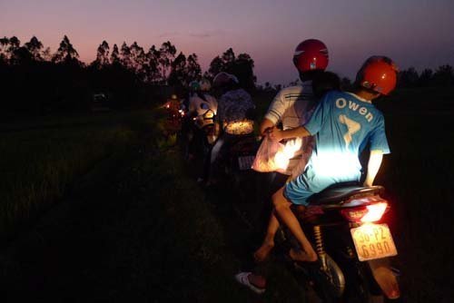 Từng dòng người cùng hàng trăm xe máy phải đi qua ruộng lúa xã Quảng Vinh về Thanh Hóa, anh Phạm Hoài Nam cho biết: “Đi tắm biển mà như đi du lịch mạo hiểm, con đường men theo ruộng lúa chỉ để người dân đi bộ, xe máy đi qua rất khó khăn”.