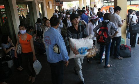 | Xếp hàng dài chờ lên xe bus |