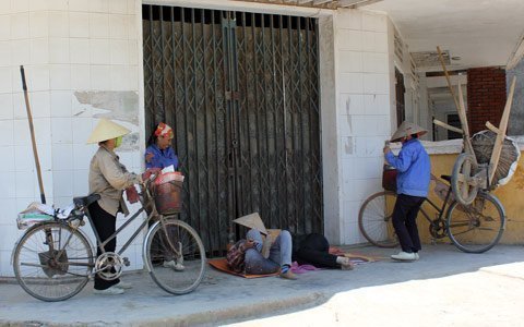 Chị Hà cho biết: “Ở nhà trọ lợp tấm tôn xi măng nóng lắm, chỉ ở ngoài lùm cây ven đường là mát nhất. Đi từ sáng đến gần tối mới dám quay về phòng trọ”.
