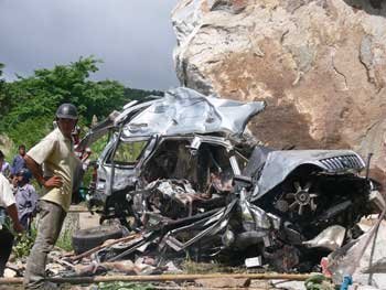 Vụ tai nạn khiến 4 người đi trên xe du lịch, 1 người trên xe gắn máy tử vong tại chỗ. Tảng đá nặng hàng tấn khi lăn xuống, kéo theo những hòn đá nhỏ khác, khiến một số người đi xe phía sau cũng bị vướng đá, thương vong, phải nhập viện điều trị.