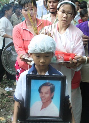 Quan tài của anh Phương vừa hạ huyệt. Đứa con gái duy nhất lững thững ôm di ảnh