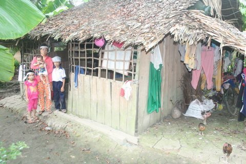 | Ngôi nhà của vợ chồng anh Nhẹ. Bên dưới chái nhà là đàn gà chờ thôi nôi bé út |