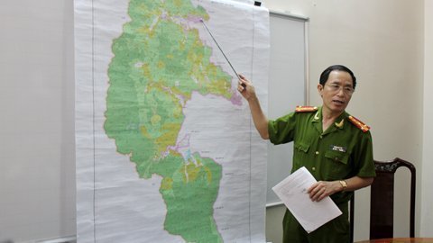 | Đại tá Hoàng Bá Thọ, Phó Trưởng ban chuyên án đang trình bày trên sơ đồ địa bàn xẩy ra vụ án phá rừng biên giới đặc biệt nghiêm trọng. Ảnh: Duy Tuấn |