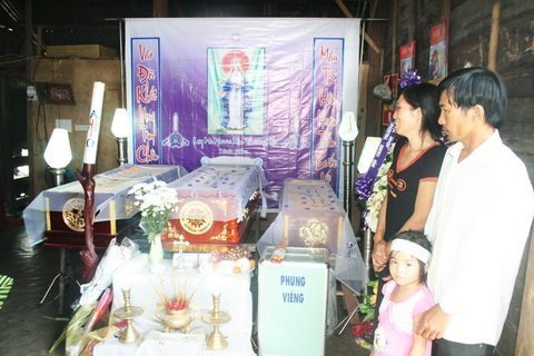 - Ba cỗ quan tài được đặt thẳng hàng chiếm gần hết diện tích của căn nhà nhỏ. Nhìn qua lớp kính áo quan, khuôn mặt 3 đứa trẻ thật hồn nhiên, thơ ngây với đôi mắt nhắm nghiền như đang chìm đắm vào giấc mơ tuổi ngọc...