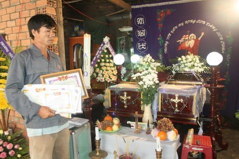 Ngước nhìn vào hai chiếc áo quan. Không một bức di ảnh. Bù vào đó, một khung ảnh với bằng khen nằm chồng lên một sấp giấy khá dày. Tôi đề nghị được xem. Anh Hòa lấy xuống. Thì ra đó là những bằng khen của hai đứa trẻ kém may mắn. Cả chị và em có đến hơn 20 bằng khen trong đó Hiệp được vinh dự có giấy chứng nhận đạt top 15 /360 học sinh thi tin học cấp huyện.