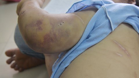 thanh gỗ… vụt, đánh tím bầm, chảy máu khắp người; có lần còn dùng con dao nhọn