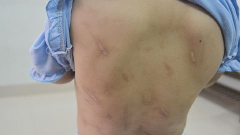| Dấu tích những vết sẹo, bầm tím để lại trên người bé Quỳnh từ những trận đòn. |