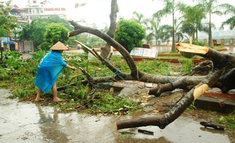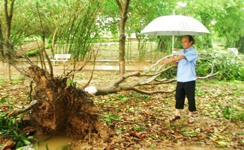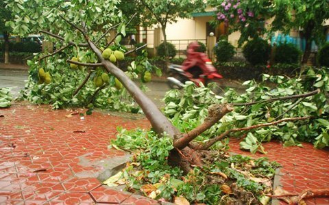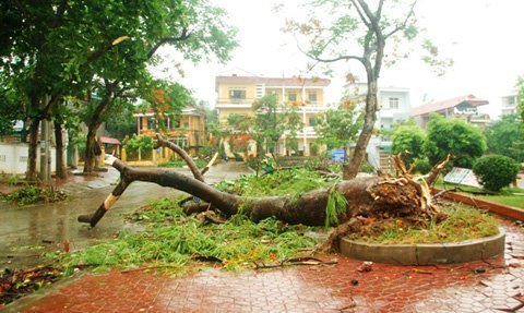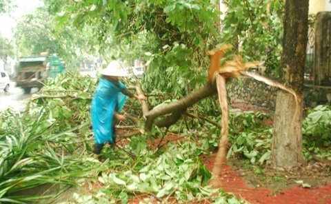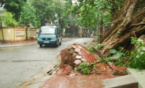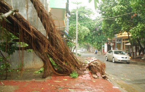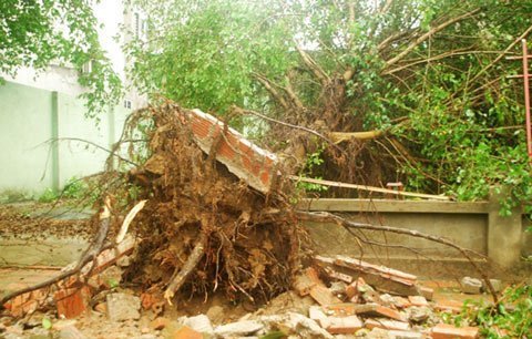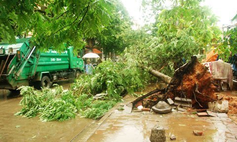 Mưa rất to, lượng mưa đo được tới gần 80mm làm nhão đất, lỏng các gốc cây, tiếp đến là lốc xoáy mạnh, giật từng cơn đã “nhổ trụi” hàng loạt cây xanh, đặc biệt là phượng vĩ, đa. Cây đa to ở phố Hồng Hà bị gió “nhấc bổng” cả chùm rễ, đổ nghiêng vào đường điện hạ thế, gây mất điện toàn thành phố đêm qua.